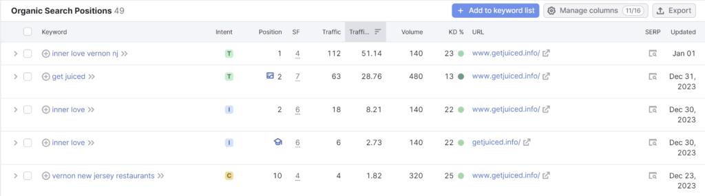 Inner Love quickly ranked for several low-difficulty, high-volume keywords with commercial search intent in their rural area, such as “vernon new jersey restaurants” and “restaurants in vernon new jersey” as seen above.