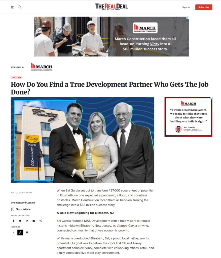 March Construction and MAS Development collaborated on a major feature article in The Real Deal. My role was to oversee, create, and execute every component of the sponsored content and digital advertising assets, from the story development and interview process to the media placement strategy and creative production.